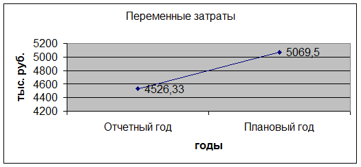 Как видно из рисунка 1, в планируемом году переменные затраты вырастут с 4526,33 до 5069,5 тыс. руб. или на 12 %