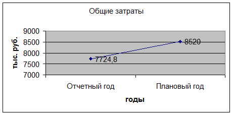 Как видно из рисунка 3, в плановом году общие затраты организации вырастут с 7724,8 до 8520 тыс. руб. или на 10 %.