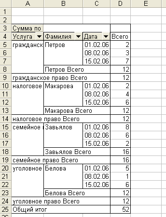 Используя сводную таблицу «Учет рабочего времени», получите данные по оказанию помощи по уголовному праву: