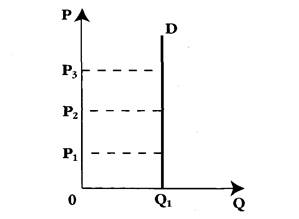 На рисунке 1 линия D показывает, что спрос абсолютно неэластичен: при любых ценах, и даже очень высоких, покупатель все равно будет приобретать товар в количестве Q1. В конце концов, платежеспособный спрос ограничен (например, уровнем P3), и фирма не может двигаться до бесконечности вверх (повышая цены) по оси ординат.