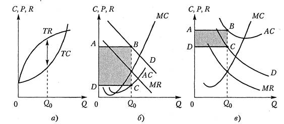 Цена определяется высотой кривой спроса (а не высотой предельной выручки) в точке выпуска, дающего максимум прибыли или минимум убытков (рис. 2, в). Равновесие монополии достигается при таком объеме производства, когда средние издержки не достигают своего минимума. Цена при этом больше средних издержек.