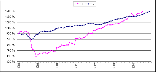 В-третьих, в 2005-2007 годах, с учетом ожидаемого снижения мировых цен на нефть и замедления динамики физического объема экспорта с 8% в 2004 году до 4.5-5%, вклад внешнего фактора в рост ВВП уменьшится на 0.7-1.0 процентных пункта. Темпы роста физического объема импорта снизятся с 13.2% в 2004 году до 9% в год в 2006-2007 годах, но останутся выше темпов роста экспорта. Вместе с тем с учетом снижения эластичности импорта к внутреннему спросу, что отражает повышение неценовой конкурентоспособности отечественной продукции, темпы роста внутреннего производства практически не сократятся. В результате среднегодовые темпы роста ВВП при благоприятном сценарии внешнеэкономических условий оцениваются на уровне 6 процентов. В случае падения мировых цен и стагнации экспорта нефти темпы роста экономики могут понизится до 5 и менее процентов.