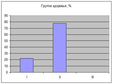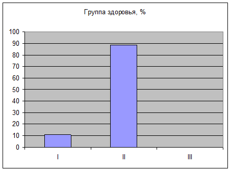 В группе А 22,2 % детей относятся к I группе здоровья, 77,7 % детей – ко II группе здоровья. В группе Б к I группе здоровья относится 11,1 % детей (на 11,1 % меньше, чем в группе А), ко второй группе здоровья относится 88,8 % детей (на 11,1 % больше, чем в группе А)