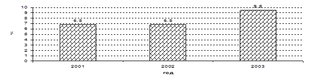 Темпы роста промышленного производства в федеральном округе продолжали оставаться стабильно высокими. По итогам 2003 года физический объем производства промышленной продукции на 9,5% (рис. 1) превысил результат аналогичного периода 2002 г. (2002/2001 гг. – 6,8%). По РФ этот показатель составил 7 %[2] (рис. 2).
