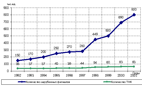 В соответствии с Докладом о мировых инвестициях (2001 год), подготовленным Конференцией Организации Объединенных Наций по торговле и развитию — ЮНКТАД (United Nations Conference on Trade and Development, UNCTAD), которая традиционно изучает деятельность ТНК, в мире насчитывается 63 тыс. транснациональных корпораций с 800 тыс. зарубежных подразделений1. В середине 90-х годов функционировало 40 тыс. таких корпораций. Они контролировали за пределами своих стран до 250 тыс. дочерних компаний. Количество ТНК за последние тридцать лет увеличилось в 9 раз (в 1970 г. было зарегистрировано лишь 7 тыс. подобных фирм, в 1976 г. их было 11 тысяч с 86 тыс. зарубежных филиалов, а в 1990 г. — 24 тыс. ТНК).[1]