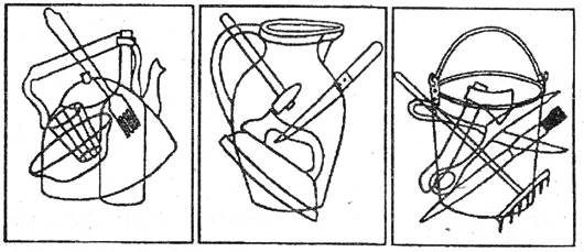 Примечание. Если проводящий психодиагностику видит, что ребенок начинает спешить и преждевременно, не найдя всех предметов, переходит от одного рисунка к другому, то он должен остановить ребенка и попросить поискать еще на предыдущем рисунке. К следующему рисунку можно переходить лишь тогда, когда будут найдены все предметы, имеющиеся на предыдущем рисунке. Общее число всех предметов, «спрятанных» на рисунках 1, 2 и 3, составляет 14.