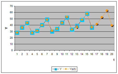 Для оценки начальных значений a(0) и b(0) построим линейную модель тренда временного ряда по первым восьми уровням Y(t).