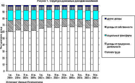 В 2003 г. произошли изменения в структуре доходов населения (Приложение, рис. 1): замедление роста доли заработной платы в общей величине доходов (2003 г. - 66,7%, 2002 г. - 66,3%, 2001 г. - 61,3%). сокращение доли социальных трансфертов, вызванное снижением их реальной величины в связи с инфляцией, до 14,5% (14,8% в 2002 г.); уменьшение доли предпринимательских доходов в общей величине денежных доходов населения до 11,5% (12,1% в 2002 г.).