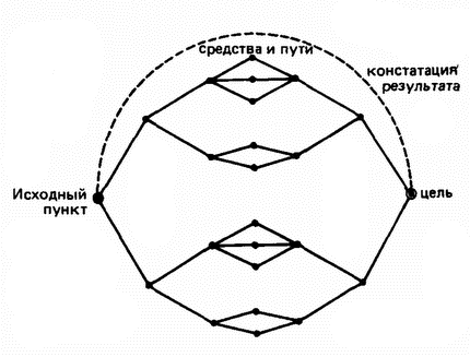 Целенаправленность поведения особенно бросается в глаза, когда один и тот же человек пытается достичь одну и ту же цель совершенно различными способами. В случае, когда непосредственная попытка достижения цели наталкивается на преграду, избирается другой, иногда обходный, путь. Таким образом, совершенно различные способы действия могут обнаружить одну и ту же целенаправленность (мотивацию). Брунсвик [Е. Brunswik, 1952; 1956] назвал это эквифинальностью и проиллюстрировал ее на так называемой модели линзы (см. рис.), разработав тем самым вероятностную модель, позволявшую при наличии данных наблюдения чрезвычайно разнообразных последовательностей действий определить их целенаправленную эквифинальность.