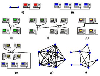 · производные: е) смешанная (комбинированная) – образована соединением типовых; ж) полносвязная – каждый узел соединен со всеми остальными; з) ячеистая – сеть, которая содержит по крайней мере два узла, имеющих два или более пути между ними (вид смешанной, в которой разделение на типовые топологии не просматривается явно);