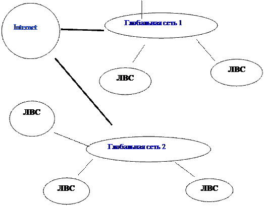 Важной особенностью Internet является то, что она, объединяя различные сети, не создает при этом никакой иерархии — все компьютеры, подключенные к сети, равноправны. Для иллюстрации возможной структуры некоторого участка сети Internet приведена схема соединения различных сетей (рис. 3).