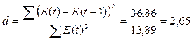 · независимости уровней ряда остатков по d-критерию (в качестве критических использовать уровни d1 = 1,10 и d2 = 1,37) и по первому коэффициенту автокорреляции при критическом уровне значения r1 = 0,32;