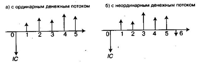 Денежный поток называется ординарным, если он состоит из исходной инвестиции, сделанной единовременно или в течение нескольких последовательных базовых периодов, и последующих притоков денежных средств; если притоки денежных средств чередуются в любой последовательности с их оттоками, поток называется неординарным. Выделение ординарных и неординарных потоков чрезвычайно важно при выборе того или иного критерия оценки, поскольку, как будет показано в дальнейшем, не все критерии справляются с ситуацией, когда приходится анализировать проекты с неординарными денежными потоками.