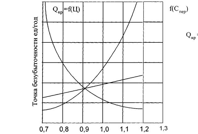 Рис.9. Зависимость точки безубыточности от изменения цены, переменных и постоянных затрат