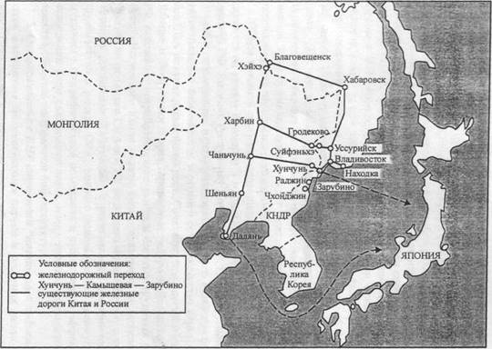 Международная активность китайских провинций Хэйлунцзян, Цзилинь и Ляонин, а также района Внутренней Монголии, составляющих Северо-Восточный Китай, порождает довольно мощные потоки экспортно-импортных грузов, в освоении транзита которых, безусловно, должны участвовать и российские железные дороги. Особо необходимо отметить, что свыше трети экспортно-импортных грузов стран СВА перевозится через российскую транспортную систему. Это определяет необходимость участия Дальнего Востока РФ развитии относительно нового экономического сообщества в СВА[9].