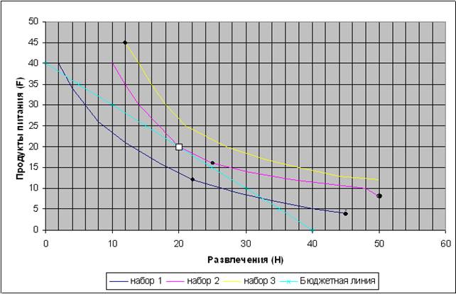 д) Наложив на построенный график бюджетную линию, можно сделать вывод о том, что набором товаров, представляющих максимальную полезность для студента является набор 20 ед. продуктов питания (F) и 20 ед. развлечений (H).