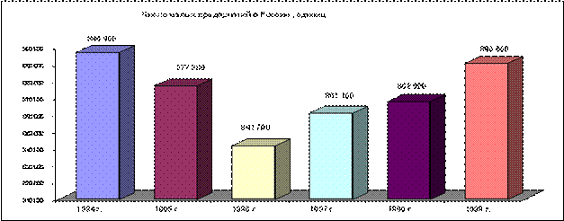К началу 2000 года число малых предприятий составило порядка 891 тысячи, приблизившись к отметке 1994 года (см. диаграмму 1). Следует учесть, что, начиная с 1996 года, статистический учет велся в соответствии с новыми критериями отнесения предприятий к малым, введенными Законом РФ «О государственной поддержке малого предпринимательства в Российской Федерации». Новые критерии заметно сузили границы этой категории предприятий, сократив максимально допустимое число работающих на одном МП с 200 до 100 человек.