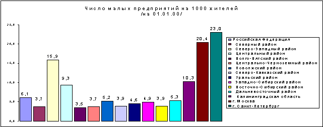 В целом, уровень развития малого предпринимательств в России, измеряемый по общепринятым в промышленно развитых странах показателям, явно недостаточный. Так, на 1000 россиян приходится в среднем лишь 6 МП (см. диаграмму 5), тогда как в странах – членах ЕС – не менее 30. Лишь Москва и Санкт-Петербург по плотности распространения малого предпринимательства приблизились к уровню Западной Европы. На 1000 их жителей приходится 20 МП и 23 МП соответственно.