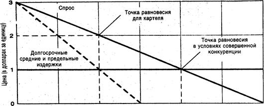 Рассмотрим на простом примере, как работают картели. Представьте себе отрасль, образованную 100 малыми фирмами. Предположим, что предельные издержки производства всех фирм составляют 1 доллар на единицу продукции независимо от объема выпуска. Так как предельные издержки одинаковы при любом объеме выпуска, кривая предельных издержек будет одновременно и кривой долгосрочных средних издержек, а также долгосрочной кривой предложения в отрасли.