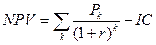 Допустим, делается прогноз, что инвестиция (IС) будет генерировать в течение n лет, годовые доходы в размере Р1, Р2, Р3. Общая накопленная величина дисконтированных доходов (РV) и чистый приведенный эффект (чистая текущая стоимость)(NРV) соответственно рассчитывается по формуле: