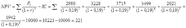 NPV=221, т.е. NPV>0; PI=1,021, т.е. PI>0; IRR=19,9%, т.е. IRR>CC.