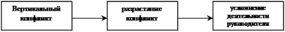 Конфликты, имеющие вертикальную составляющую, насчитывают порядка 75 % всех конфликтов. Именно они наиболее нежелательны для руководителя, так как, будучи задействованным, в конфликте он связан в своем поведении. Поскольку подчиненные не располагают всей необходимой информацией и не имеют достаточной подготовки для квалифицированной оценки действий руководителя, то их некомпетентность с лихвой компенсируется различными домыслами, преимущественно агрессивного характера.