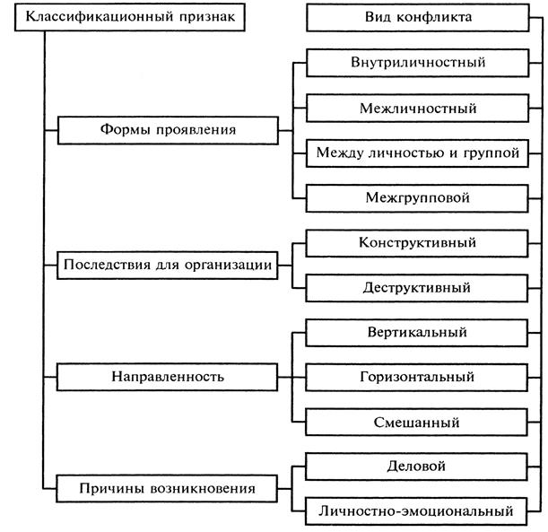 Первый классификационный признак – форма проявления. Выделяют внутриличностный, межличностный, межгрупповой конфликты и конфликты между личностью и группой.