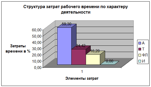 - в структуре затрат рабочего времени по характеру деятельности наибольшее значение имеет время организационно-административной работы работы, заключающееся в анализе показателей, подготовке выводов и рекомендаций.