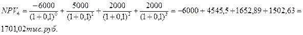 Чем выше показатель NPV, тем более эффективен проект. Таким образом, в задаче будет выбран проект 2, как наиболее прибыльный.