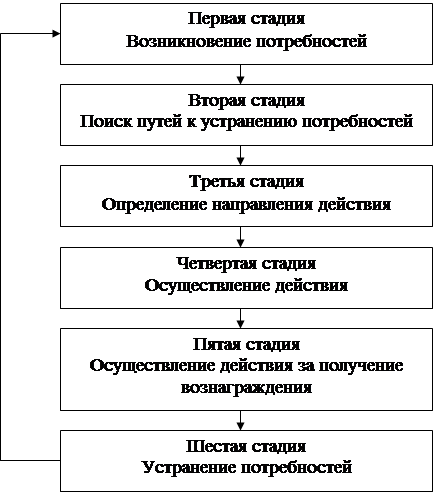 Мотивация рассматриваемая как процесс, теоретически может быть представлена в виде шести следующих одна за другой стадий. Естественно, такое рассмотрение процесса носит достаточно условный характер, так как в реальной жизни нет столь четкого разграничения стадий и нет обособленных процессов мотивации. Однако для уяснения того, как разворачивается процесс мотивации, какова его логика и составные части, может быть приемлема и полезна ниже приводимая модель [1].