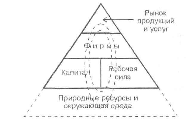 Представление о месте экологии в рыночной экономике можно иметь, опираясь на пирамиду Р. Нуссбаума.[2] Он считает, что в основании такой пирамиды лежит окружающая среда и ее природные ресурсы. Выше расположены капитал и рабочая сила. На ступень выше находятся предприятия и фирмы. Вершина пирамиды представлена непосредственно рынками продукции и услуг. Традиционный рынок работает по малому контуру (рис. 1.1) и экологическую сферу затрагивает только частично при вовлечении в производство природных ресурсов.