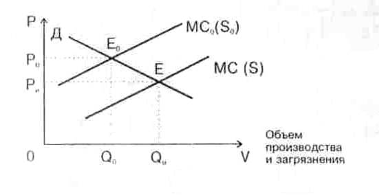 Методами интернализации внешних эффектов могут быть всевозможные экологические платежи, налоги и др. рычаги как административного, так и экономического характера. В общем виде процесс интернализации внешних эффектов сводится к сведению частных предельных (дополнительных) издержек, не включающих затраты на возмещение ущерба (МС) в общественные предельные издержки (то во что обходится обществу производство товара) (МС0). Иначе говоря, должно быть смещение кривой предложения (S) с целью оптимизации цены на товар, производство которого загрязняет окружающую среду (рис. 3.1).