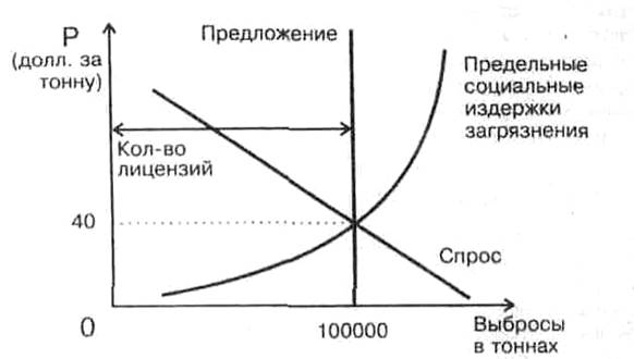 Такой рынок существует на основе установленных предельных объемов загрязнения, которая принимает форму абсолютно неэластичного предложения сброса отходов. На графике равновесие спроса и предложения достигается при условии, что предельные затраты на снижение уровня загрязнения окружающей среды одинаковы для всех предприятий. Но на практике предельные издержки на разных предприятиях не одинаковы, что и дает возможность торговли правами на загрязнение. Собственно рынок прав на загрязнение сводится к определению цены прав на загрязнение в зависимости от соотношения спроса и предложения. Как показали исследования, в краткосрочном аспекте как спрос, так и предложение малоэластичны по цене, а в долгосрочном – наоборот.