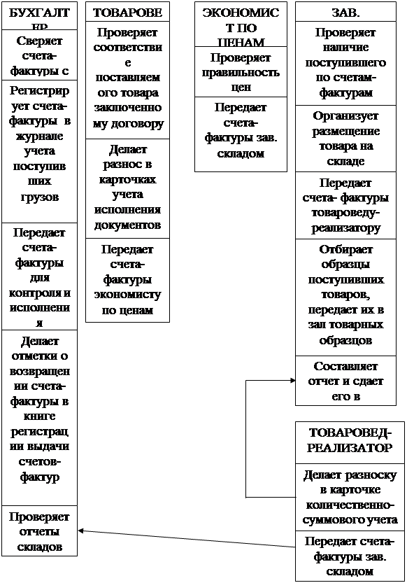 Как видно из рисунка 2, основными штатными единицами ООО «Хозяйственные товары», задействованными в процессе приемки товаров на склад являются бухгалтер, товаровед, экономист по ценам и зав. складом.