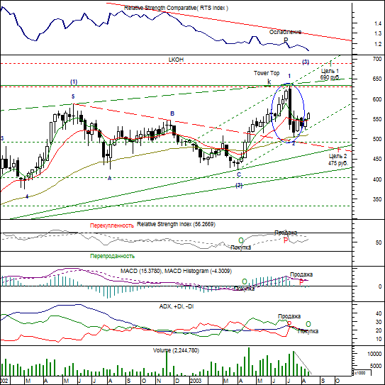 Резкий спад цен Лукойла в середине июля сменился робкими попытками начать новую волну повышения. На недельном графике видно, что откат от уровня 635 руб. вернул цены к текущему значению годового (52-недельного) скользящего среднего (жёлтая кривая), играющего роль долгосрочной поддержки. О важности для рынка уровня сопротивления на 635 руб. уже говорилось в предыдущих комментариях (см. статьи "Лукойл достиг локальной цели повышения..." от 07.07.03.и "Коррекция роста на рынке Лукойла ... приобретает характер дизажио" от 09.07.03). Кроме того, величина коррекции к предыдущей волне роста с 421 руб. до 634.49 руб. составила ровно 61.8% (503 руб.), что является стандартным уровнем коррекции Фибоначчи. Умеренный долгосрочный восходящий тренд (утолщённая зелёная линия) остаётся в силе, а тот факт, что акция по-прежнему торгуется выше кривой годового скользящего среднего, заставляет рассматривать Лукойл как бычью бумагу в долгосрочной перспективе. На текущий момент цены поднялись также выше месячного (4-недельного) скользящего среднего (зелёная кривая) и квартального (13-недельного) скользящего среднего (красная кривая), подавших также как и дирекционная система сигнал к покупке. Осцилляторы (индекс относительной силы RSI(14) и MACD) сигналы на продажу не отменили, но кривая RSI(14) и гистограмма повышаются. Наметился ускоренный среднесрочный восходящий канал (тонкие красные пунктирные линии). Падение торговых оборотов свидетельствует о коррективном характере движения, но свечная медвежья конфигурация «Tower Top» (синий овал), появившаяся на вершине рынка, служит медвежьим сигналом, который пока не преодолён. Ещё одним негативным аспектом является продолжающееся неуклонное ослабление Лукойла по сравнению с индексом РТС. С позиций волнового принципа повышение цен с 421 руб. до 634.49 руб. можно рассматривать как волну «1» малой степени в структуре восходящей импульсной волны «(3)» промежуточной степени. Спад с 634.49 руб. до 503 руб. – вероятно волна «2» тоже малой степени. Такая разбивка носит лишь характер рабочей схемы и не является безупречной. Слабым пунктом в таком подходе является внутренняя структура предполагаемой волны «1», которую трудно идентифицировать как трендовую модель. Анализ дневного графика пока не даёт сколько-нибудь приемлемой трактовки. Тем не менее, такая рабочая схема предполагает восстановление роста в долгосрочной перспективе. Возможная цель повышения в рассматриваемом временном горизонте – уровень 161.8%-ого растяжения (красная пунктирная горизонталь) волны спада «(2)» промежуточной степени (с 586.69 руб. в конце мая 2002 года до 421 руб. в начале апреля 2003 года) – 690 руб. (цель 1). Если же волна «2» не завершена или вовсе развивается иной сценарий, то возможная ближайшая цель падения лежит в точке пересечения двух тенденций – действующей восходящей (зелёная линия) и прорванной вверх нисходящей (красный пунктир) – 475 руб. (цель 2).