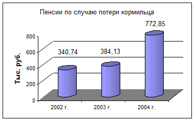 Сумма начисленных пенсий по случаю потери кормильца увеличилась в 2004 году по отношению к 2002 году на 432,11 тыс. руб., по отношению к 2003 году – на 388,72 тыс. руб. (Рис. 7).