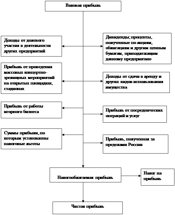 Таким образом, формирование чистой прибыли можно представить как последовательное уменьшение первоначально полученной валовой прибыли по алгоритму, устанавливаемому законодательством РФ (Рисунок 2).