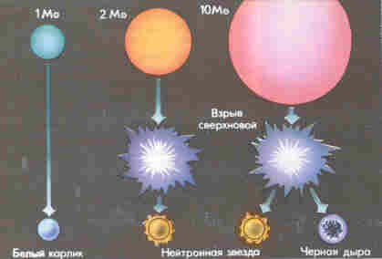 Иная судьба у более массивных звезд. Если масса звезды примерно вдвое превышает массу Солнца, то такие звезды на последних этапах своей эволюции теряют устойчивость. В частности, они могут взорваться как сверхновые, обогащая межзвездную среду тяжелыми химическими элементами (которые образовались внутри звезды и во время ее взрыва), а затем катастрофически сжаться до размеров шаров радиусом в несколько километров, т. е. превратиться в нейтронные звезды.