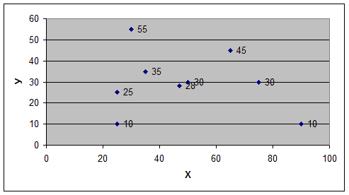 Рис.1. Координаты магазинов и расположение склада