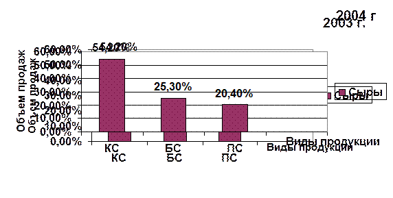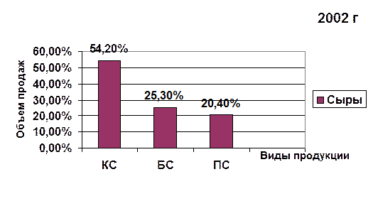 Рис. 4. Удельный вес по видам продукции предприятия в 2002 году КС – колбасный сыр БС – брикетный сыр ПС – пастообразный сыр