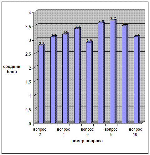 В таблице средняя оценка по каждому вопросу определяется как деление общей суммы балов по каждому вопросу на количество опрошенных ( 10 человек).