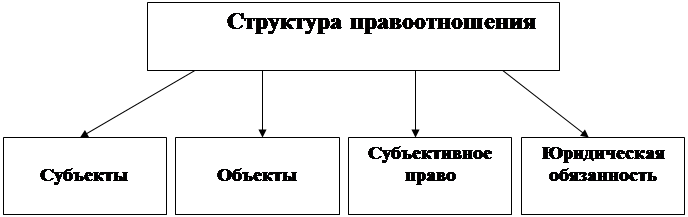 Структура правового отношения имеет четыре необходимых элемента: субъекты, объекты, право и обязанность.