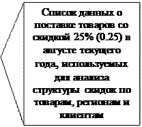 Исходя из результатов анализа информационной потребности, определяем состав и структуру требуемого сообщения S(Данные о поставке товаров со скидкой 25% (0.25) в августе текущего года, используемые для анализа структуры скидок по товарам, регионам и клиентам):
