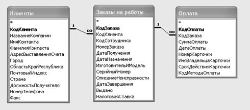 FROM Клиенты INNER JOIN ([Заказы на работы] INNER JOIN Оплата ON [Заказы на работы].КодЗаказа = Оплата.КодЗаказа) ON Клиенты.КодКлиента = [Заказы на работы].КодКлиента