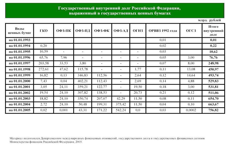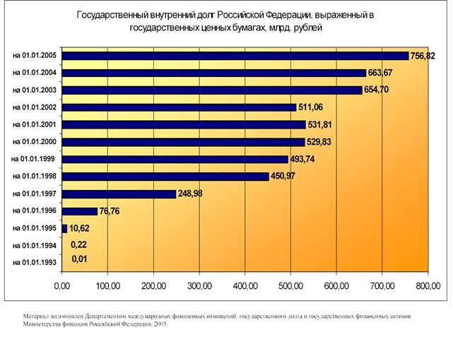 В материалах, представленных на коллегию, подчеркивается, что по состоянию на 1.01.2001 г государственный внутренний долг РФ составил 557.4 млрд руб и увеличился по сравнению с 1.01.1993 г в 156 раз. В основном рост государственного внутреннего долга произошел за период с 1.01.1993 г по 1.01.1998 г, что обусловлено как ростом рынка государственных ценных бумаг, эмитированных в целях покрытия дефицита федерального бюджета, так и принятием на государственный внутренний долг различного вида задолженностей перед Банком России, возникших как до распада СССР, так и после этого события.
