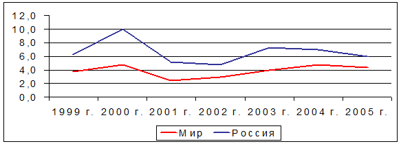Однако статистика последних лет показывает, что экономика России седьмой год подряд развивается высокими темпами. За предыдущие годы (1999 – 2004 гг.) ВВП России увеличился почти на 48%, а среднегодовой темп прироста составил 6,7%.