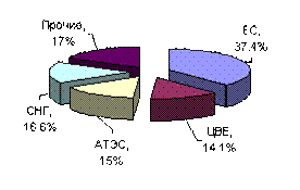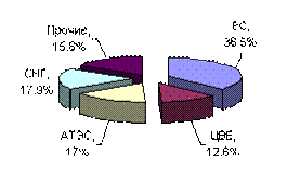 Распределение экспортных потоков свидетельствует о произошедшем сдвиге в сторону расширения обмена с развитыми странами с рыночной экономикой при сокращении удельного веса развивающихся стран, что объясняется сформировавшейся специализацией России в международном разделении труда в качестве мирового поставщика сырьевых ресурсов, в первую очередь, энергоносителей, главными потребителями которых и являются промышленно развитые страны.