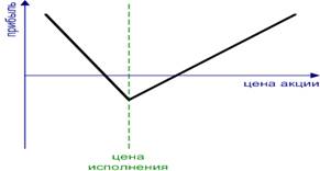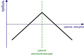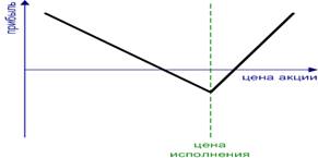 1. Стрэддл (стеллаж) (рис.4,5) - покупка опционов колл и пут с одинаковыми датами истечения и ценой исполнения. Данная стратегия – стратегия торговли волатильностью (волатильность – это показатель колебания доходности базисного актива до даты исполнения опциона). Здесь не важно, в какую сторону изменится цена базисного актива, важно, чтобы в принципе она изменялась, либо изменялись представления инвесторов о ней, или при стабильном рынке происходили некоторые колебания. На этих колебаниях и зарабатывает инвестор;