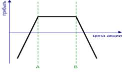 Продажа стрэнгла. Short Strangle. Данная стратегия заключается в продаже опционов колл и пут с одним сроком истечения контрактов, но разными ценами исполнения. Цена исполнения колла(В) должна быть больше, чем пута(А). Используется, если ожидается, что цена базового актива не изменится, волатильность понизится. (рис.7)