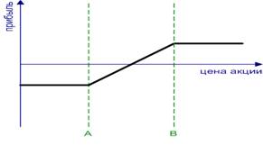 Покупка стрэнгла. Long Strangle. Данная стратегия заключается в покупке опционов колл и пут с одним сроком истечения контрактов, но разными ценами исполнения. Цена исполнения колла должна быть больше(В), чем пута(А). Используется, если ожидается, что цена базового актива изменится, волатильность повысится. (рис.6)